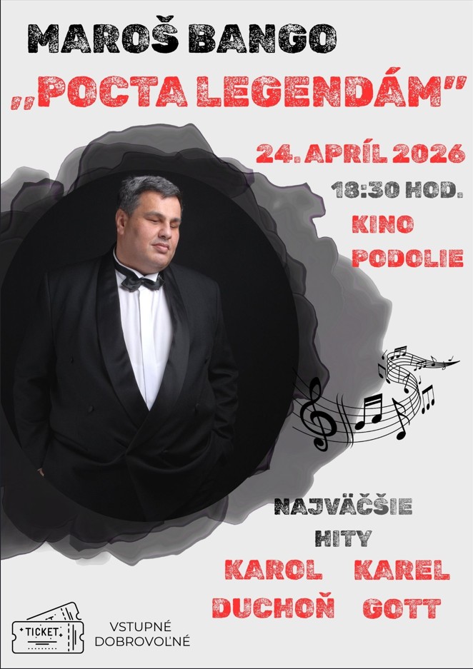 V piatok (24.04.2026) Vás pozývame na hodový koncert ,,POCTA LEGENDÁM" v podaní speváka MAROŠA BANGA. Koncert sa odohrá o 18:30 hod. v našom podolskom kine. Počas koncertu zaznejú hity Karola Duchoňa a Karla Gotta. Vstupné dobrovoľné. Tešíme sa na Vašu účasť!