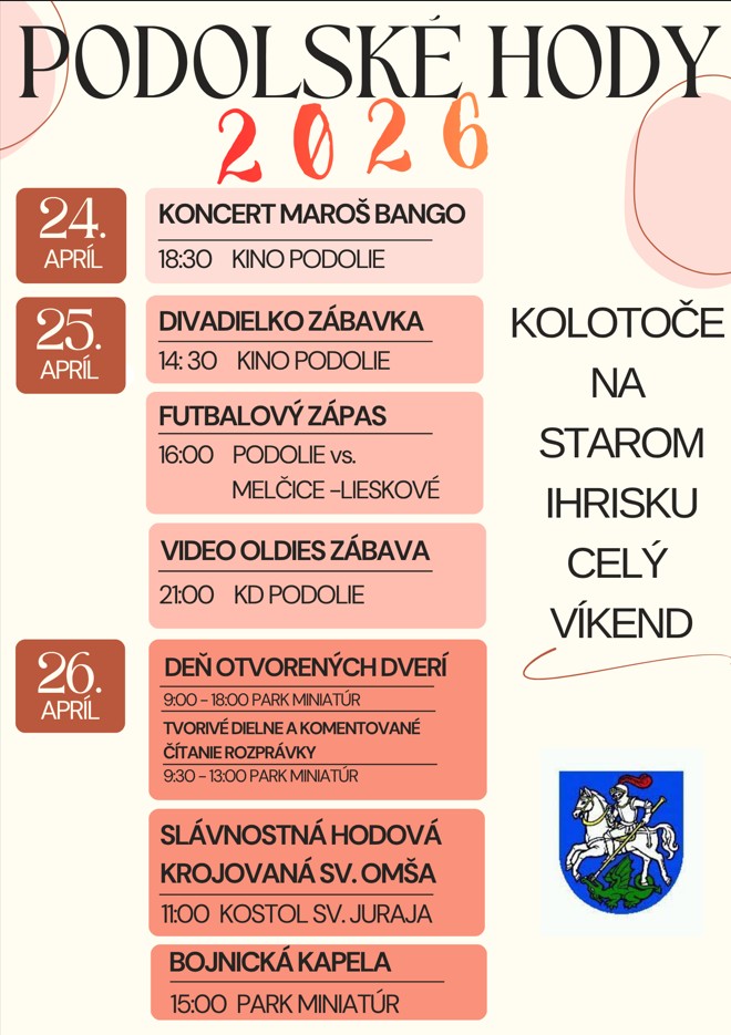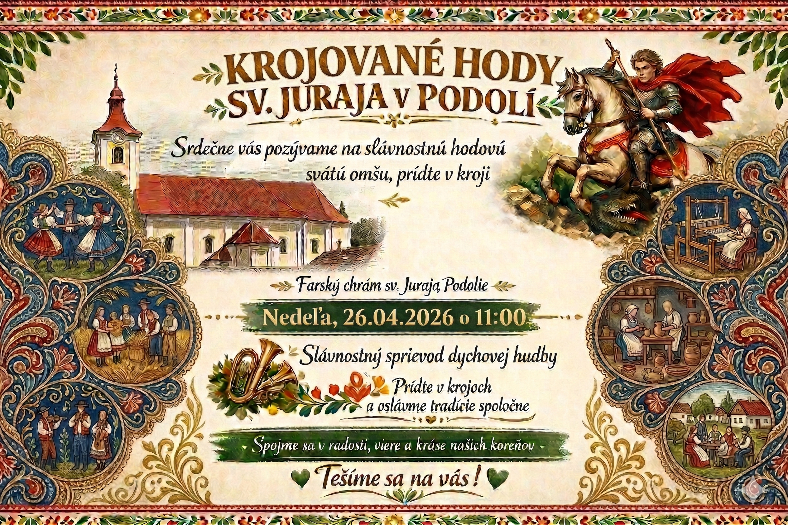 V nedeľu ( 26.04.2026) Vás všetkých pozývame na slávnostnú KROJOVANÚ SV. OMŠU o 11:00 hod. v Kostole sv. Juraja v Podolí. Príďte v krojoch a oslávme tradície spoločne!