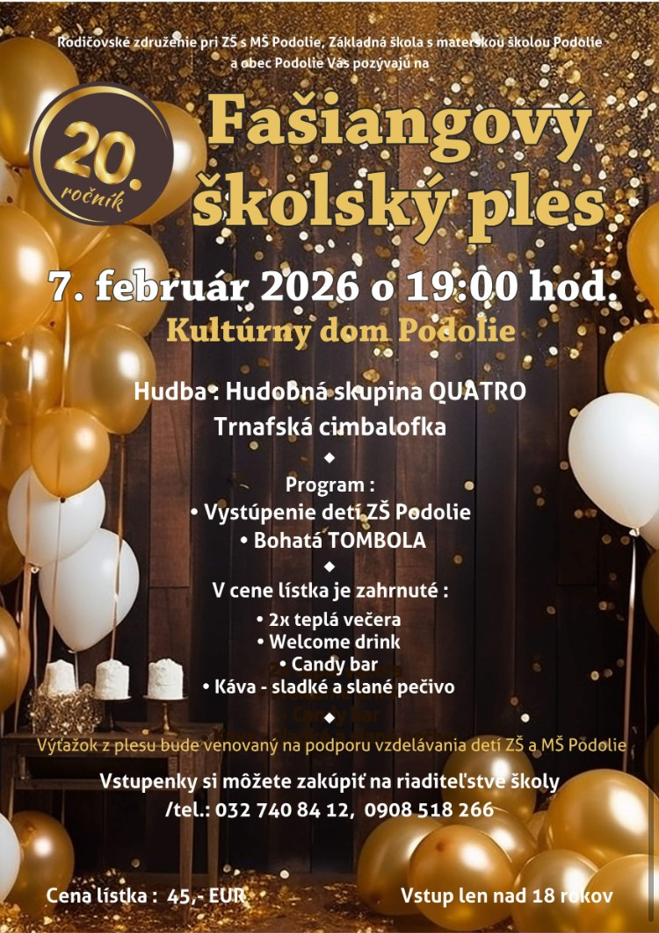Rada rodičov v spolupráci so ZŠ s MŠ Podolie a obcou Podolie Vás srdečne pozývajú na 20. výročný Fašiangový školský ples, ktorý sa bude konať v sobotu 7.2.2026 o 19.00 hod. v KD Podolie.