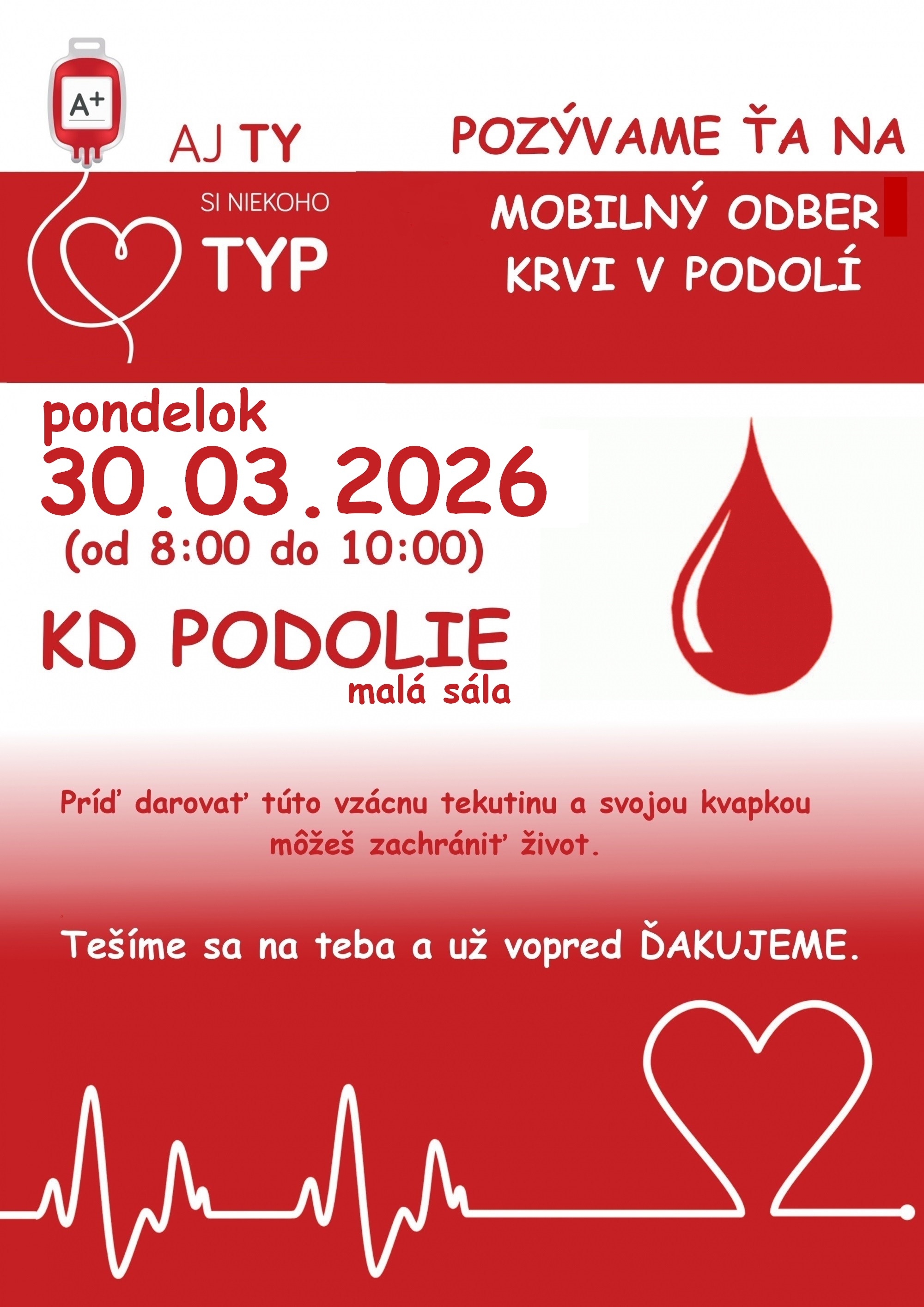 Pozývame na mobilný odber krvi, ktorý sa uskutoční v pondelok 30.03.2026 v malej sále KD Podolie v čase od 8.00 do 10.00 hod.. Všetci sú vítaní, aj tí, ktorí ste ešte nedarovali, netreba mať strach. Práve naopak, Váš dobrý skutok pomôže zachrániť a zlepšiť zdravie druhým ľuďom, ktorí to potrebujú. Tešíme sa na Vás!