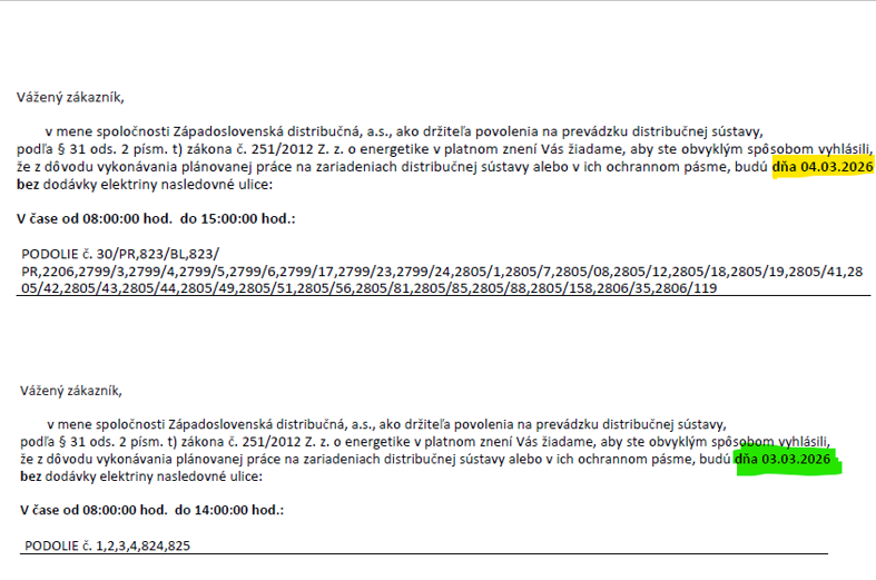 Západoslovenská distribučná, a.s. oznamuje plánované prerušenie distribúcie elektriny v dňoch 03.03.2026 a 04.03.2026. Rozpis nájdete v prílohe, ak nemá nehnuteľnosť pridelené súpisné číslo, uvádza sa číslo parcely.